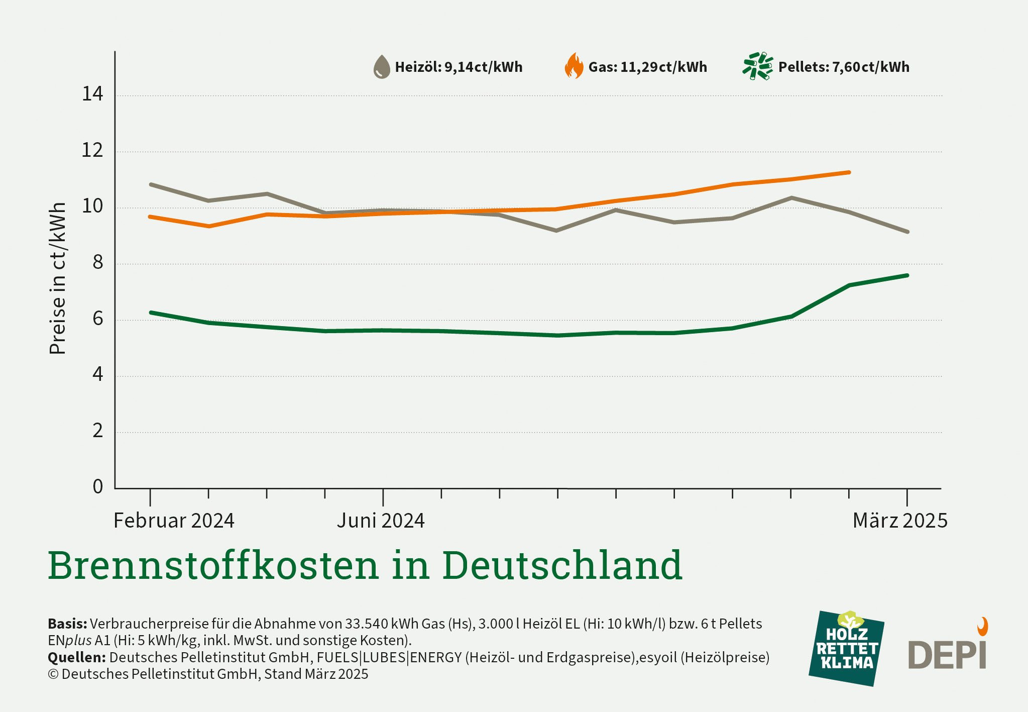 Im März bewegt sich der vom Deutschen Pelletinstitut (DEPI) erhobene Pelletpreis kaum. Eine Tonne kostet durchschnittlich 380,20 Euro, was einem Plus von 4,7 % im Vergleich zum Februar entspricht. Danach kostet eine Kilowattstunde Wärme aus Pellets 7,60 Cent. Der Preisvorteil gegenüber Heizöl hat sich verringert und liegt nun bei rund 17 %.