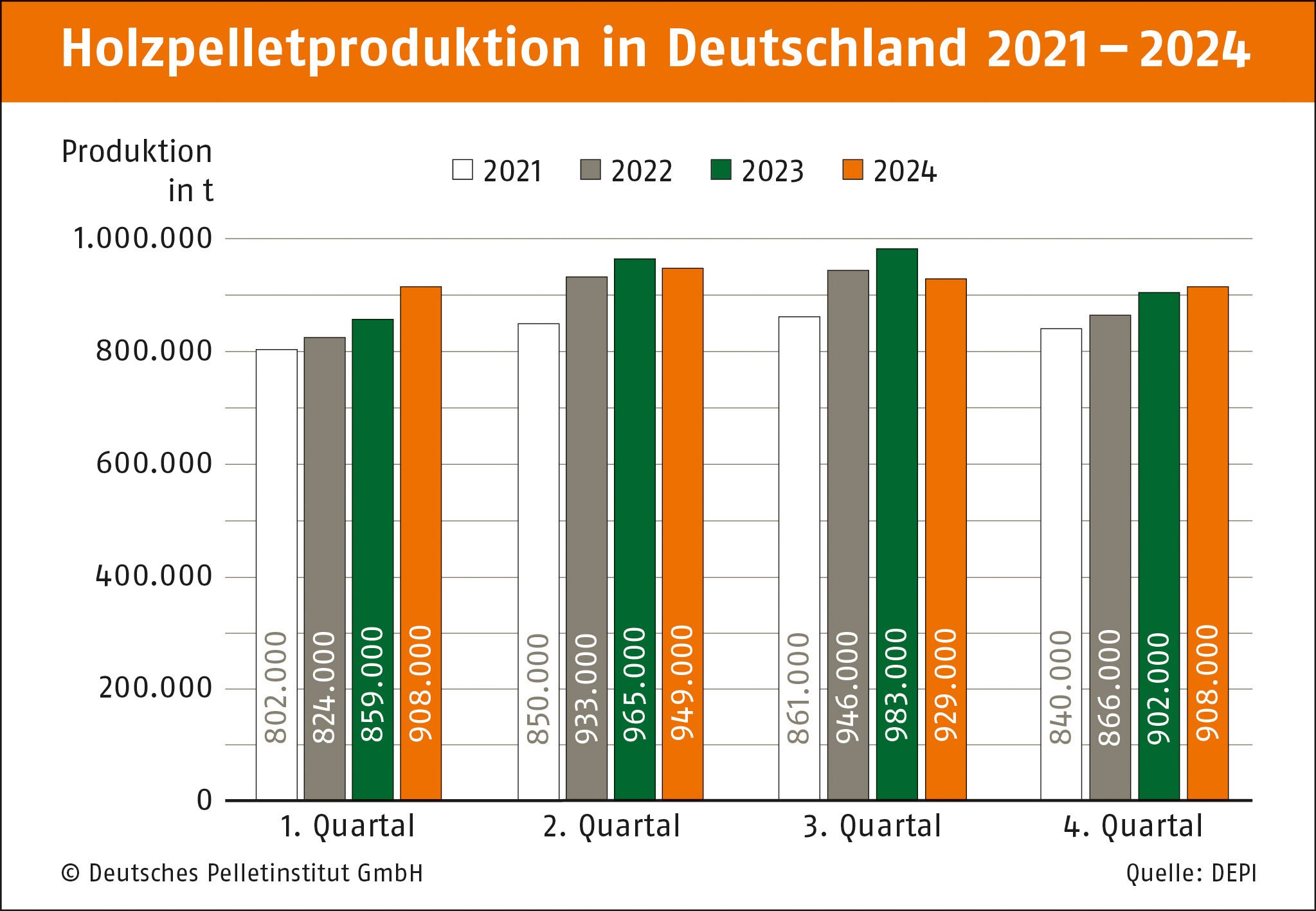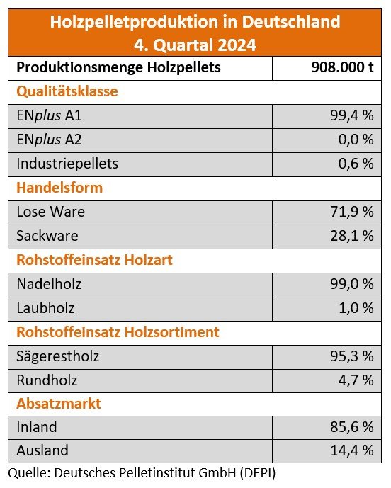 Berlin, 23.01.2025 • Mit 908.000 Tonnen (t) wurden im vierten Quartal 2024 in Deutschland nur etwas mehr Pellets als im Vorjahreszeitraum (902.000 t) hergestellt. Wie in den vergangenen Jahren ging die Menge im Vergleich zum dritten Quartal zurück, und zwar um 2,3 Prozent. Der Anteil an Sackware (28,1 %) sank zu beiden Vergleichszeiträumen leicht, wobei der Exportanteil (14,4 %) wieder höher ausfällt. Sägerestholz als Rohstoff bewegt sich mit 95,3 Prozent auf sehr hohem Niveau, zuletzt wurden 2019 und 2021 ähnliche Anteile erreicht.