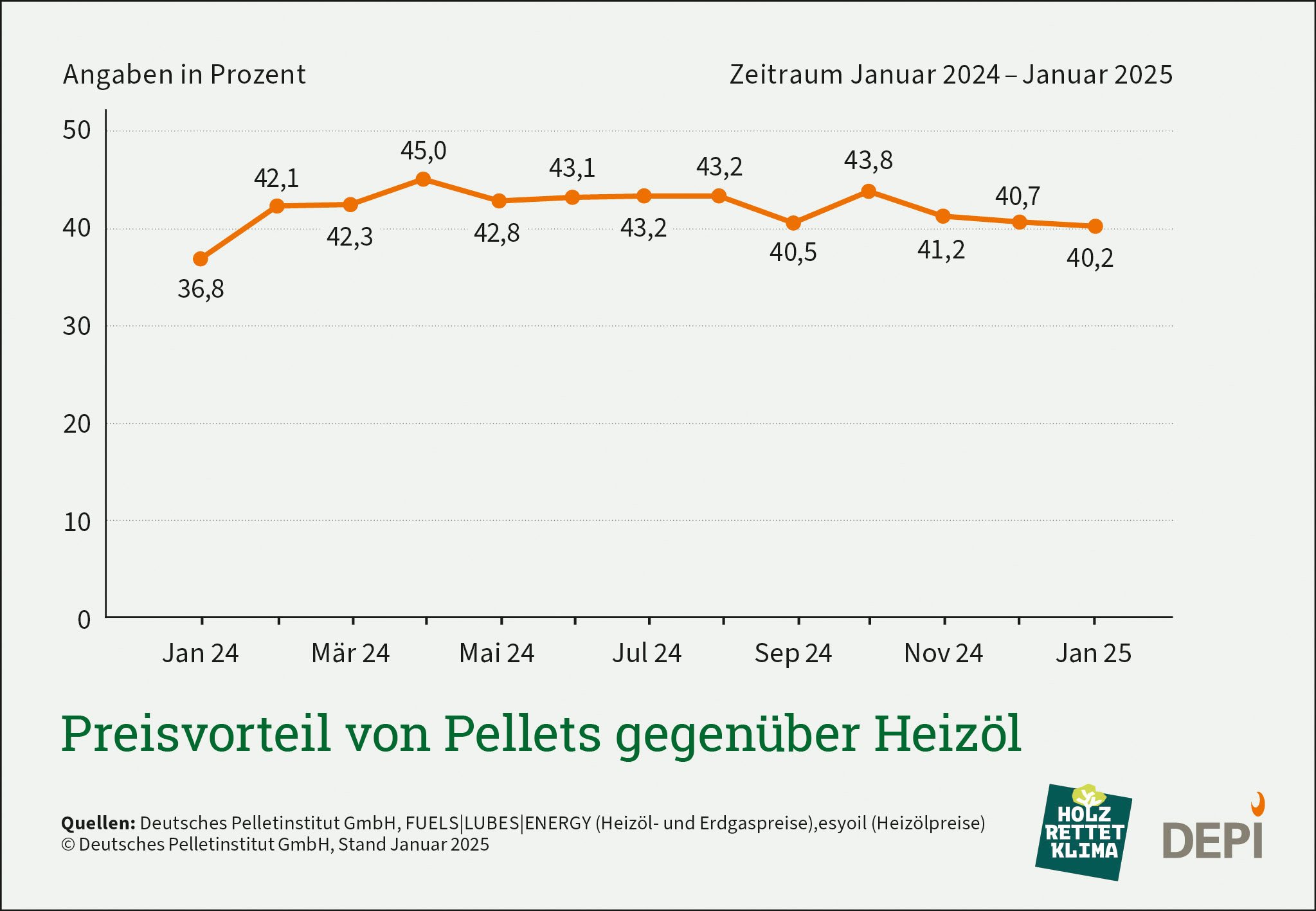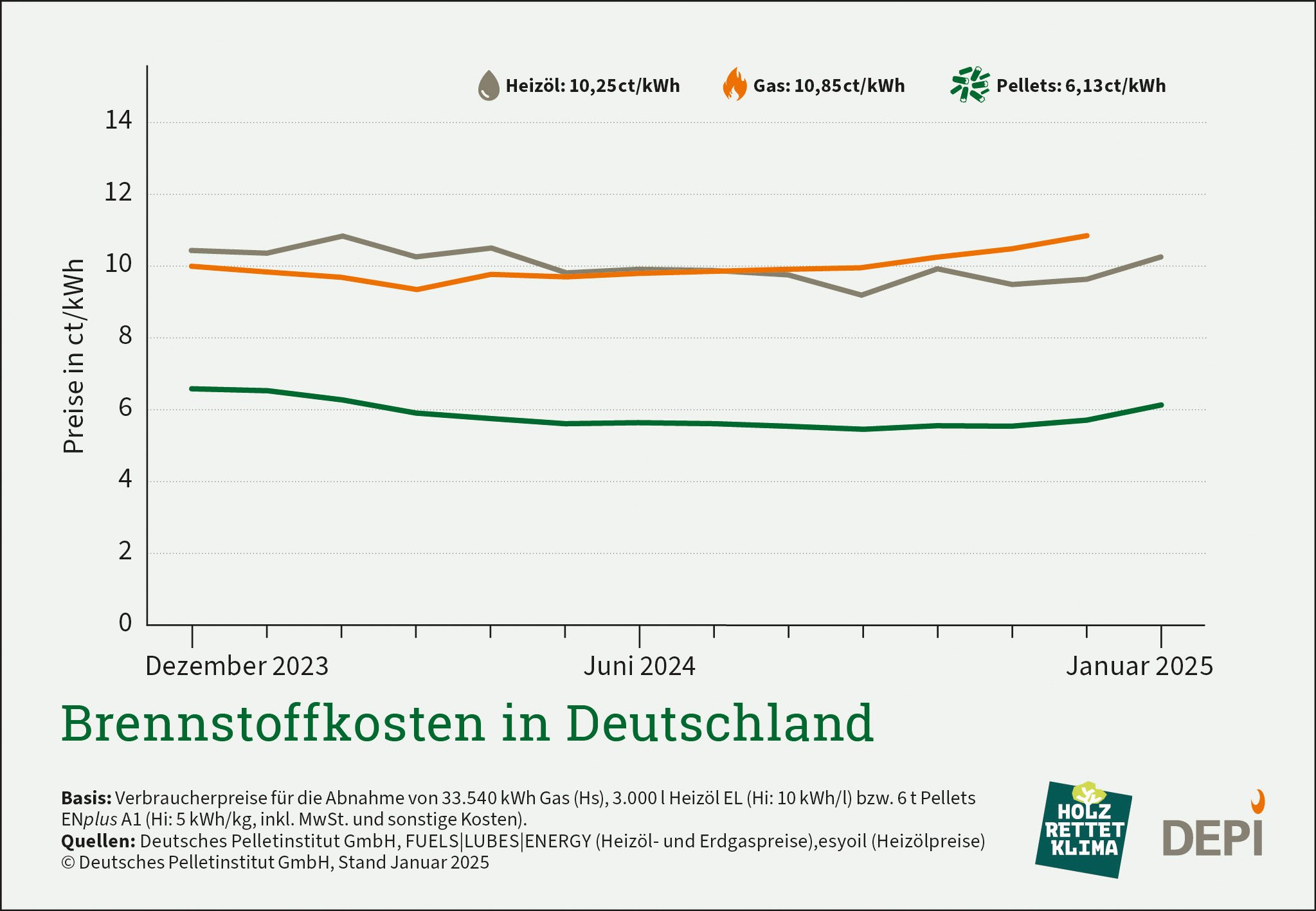 Berlin, 17.01.2025 • Pelletheizer können sich freuen: Wärme aus Pellets bleibt kostengünstig, denn die Kosten für die Holzpresslinge liegen im Januar bei einem für die Wintermonate üblichen Preisniveau. Dass das Heizen mit Pellets nicht ausschließlich in unsanierten Gebäuden, sondern auch in Neubauten die wirtschaftlich attraktivste Lösung ist, belegt aktuell auch eine Berechnung der Verbraucherzentrale NRW und des Handelsblatts. Derzeit zahlen Pelletnutzer für eine Tonne (t) des Brennstoffs laut dem Deutschen Pelletinstitut (DEPI) durchschnittlich 306,35 Euro. Im Vergleich zum Vormonat bedeutet dies eine Steigerung von etwa 7 Prozent (Dezember 2024: 286,04 Euro). Eine Kilowattstunde Wärme aus Pellets kostet demnach 6,13 Cent. Der Preisvorteil gegenüber Heizöl von rund 40 Prozent bleibt konstant.